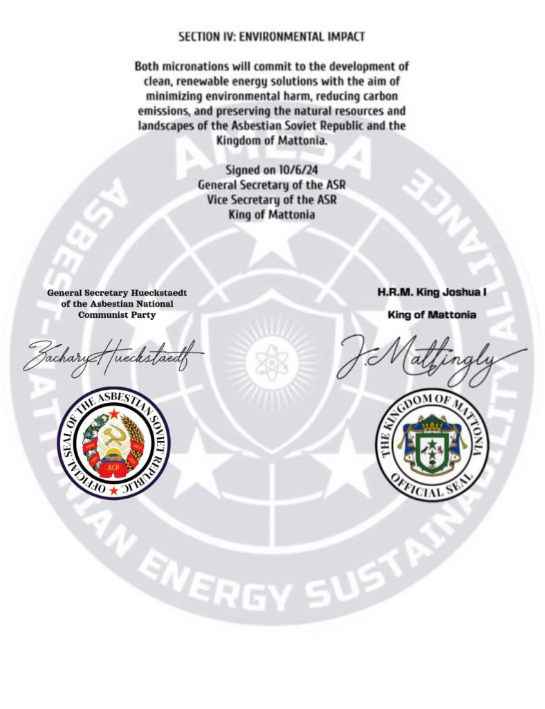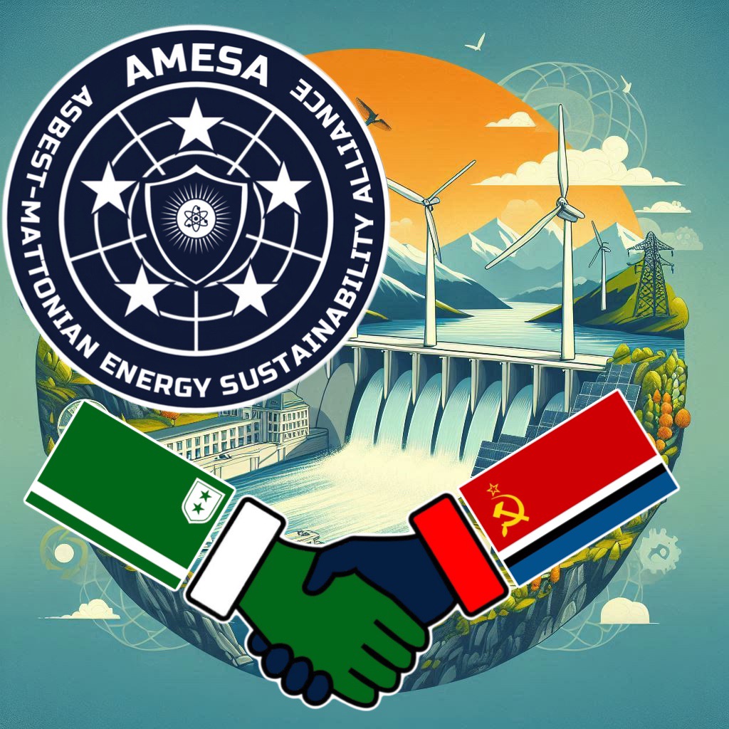 The Kingdom of Mattonia has reached a historic agreement with the Asbestian Soviet Republic, heralding a new chapter in sustainable energy development. Under Official Government Decree No. 12/2024, the two micronations have formalized the creation of the Asbest-Mattonian Energy Sustainability Alliance (AMESA), a strategic partnership aimed at fostering the growth of renewable energy technologies.